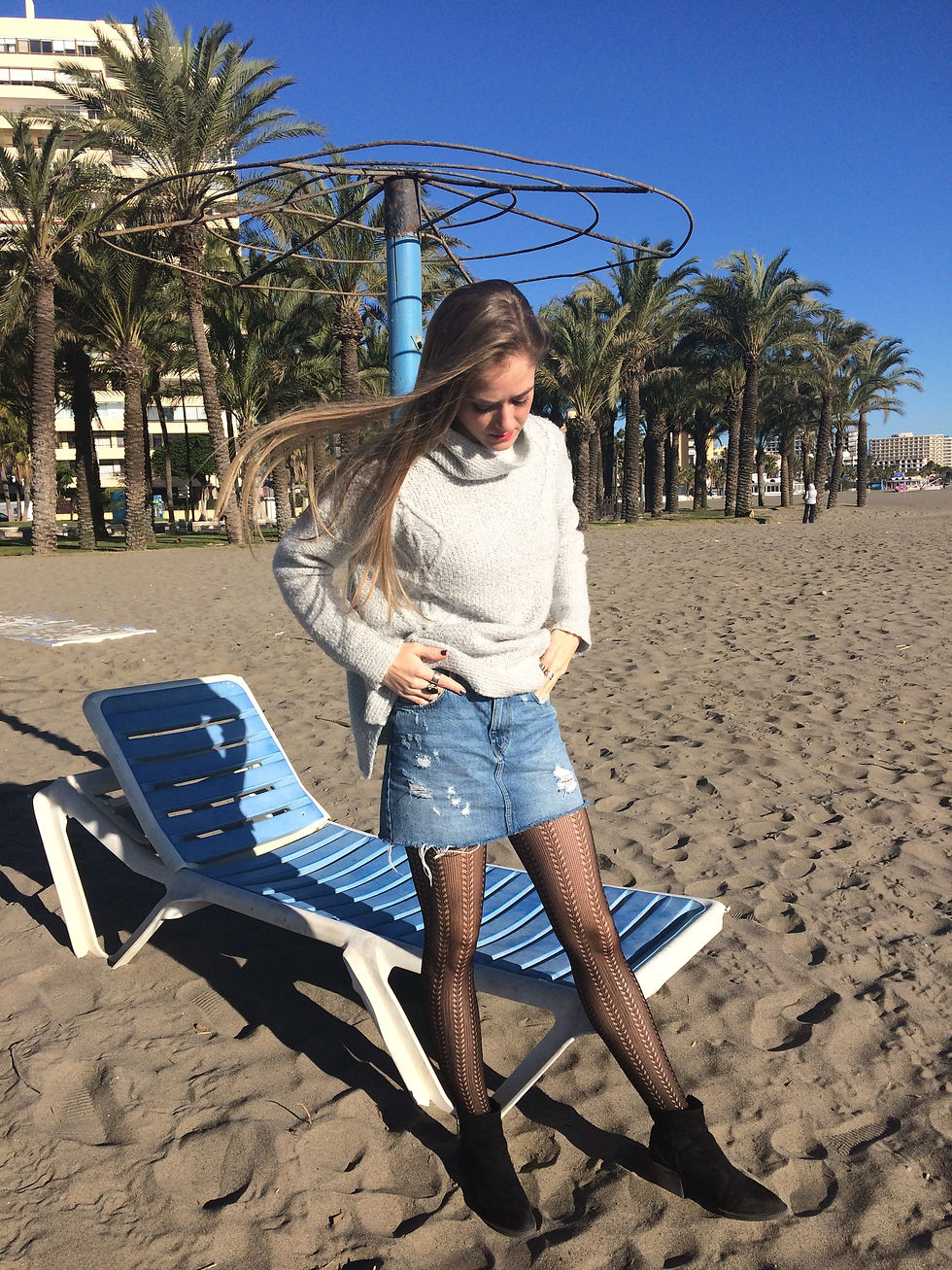 Una de las prendas más de moda es la media agujereada. Yo en este caso llevo una de Calzedonia un poco más sencilla, y la he combinado con una falda vaquera de la temporada pasada de Zara, y un Jersey de Sfera. Haz click en alguna de éstas fotos para ir a la web de Calzedonia.
