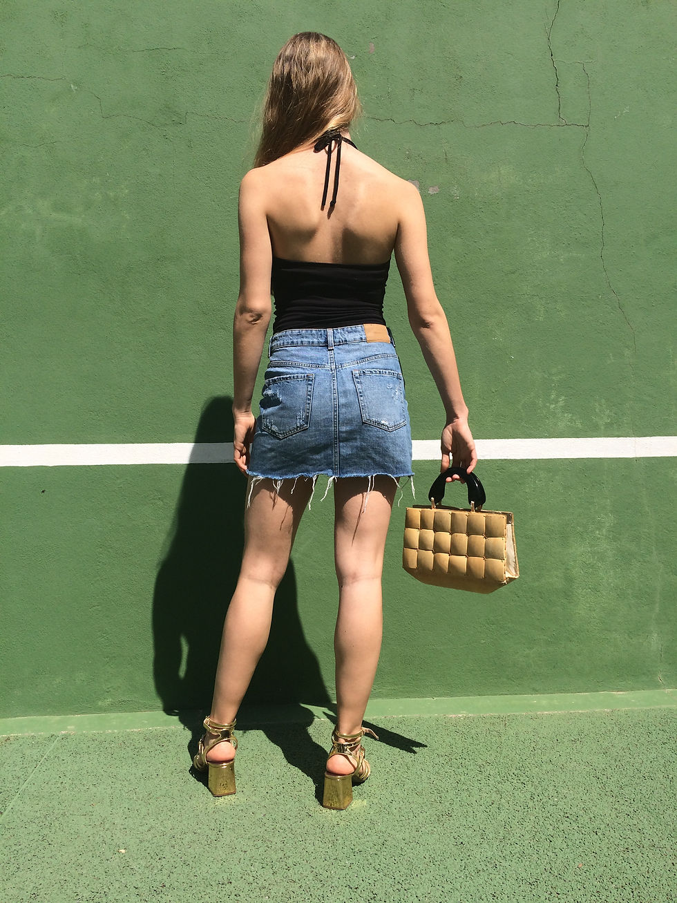 Jueves!!!!! Hoy os enseño un outfit muy fresquito y con complementos muy chulos. Las prendas principales y que podréis encontrar en web son la falda mini vaquera de nueva temporada de Zara y el body negro con espalda descubierta de ASOS.